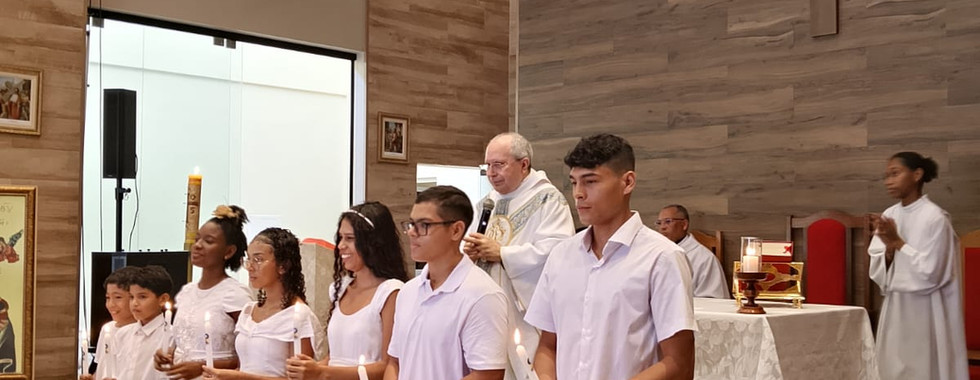 Na Capela de Santos Inocentes aconteceu, na manhã do dia 16/11/25, um momento de grande emoção e significado para diversas crianças e suas famílias: a celebração da Primeira Eucaristia. A cerimônia, marcou o primeiro recebimento do Sacramento da Eucaristia pelos jovens fiéis.